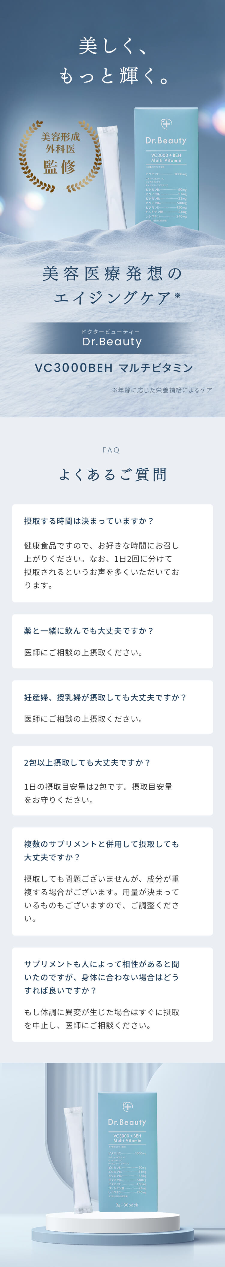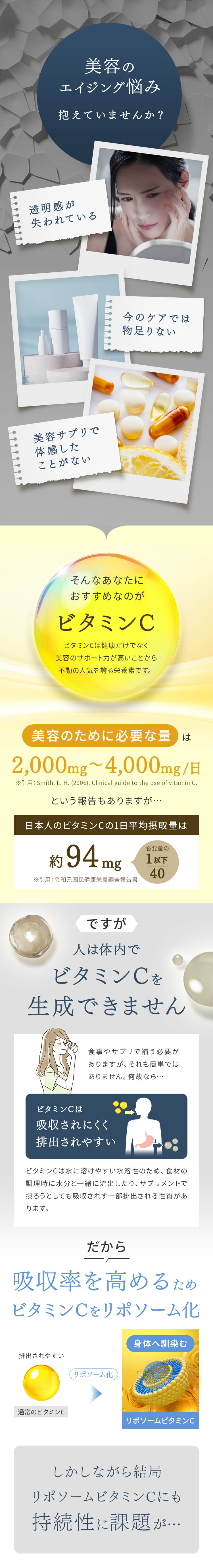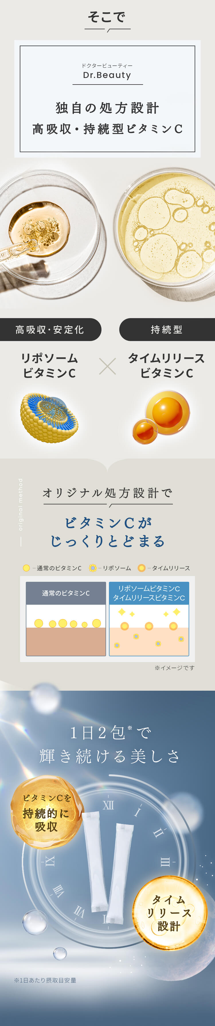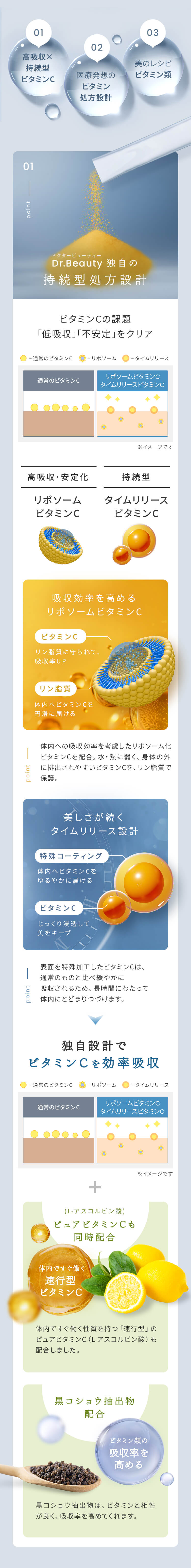 | 特徴 | 01:医療発想のビタミン処方設計 02:独自の高吸収×持続型ビタミンC 03:ビタミン・栄養素の吸収アップ 04:こだわりの剤形 従来のビタミンCサプリメントの課題を解決し、理想の効果を実現する革新的な製品です。 リポソーム化ビタミンC、タイムリリースビタミンCなどを独自の処方設計で配合することで、高い吸収率と吸収持続性を両立しました。 さらに、美容と健康に必要な美容医療機関でも処方されるビタミン・栄養素を配合したマルチビタミンサプリメントです。 |