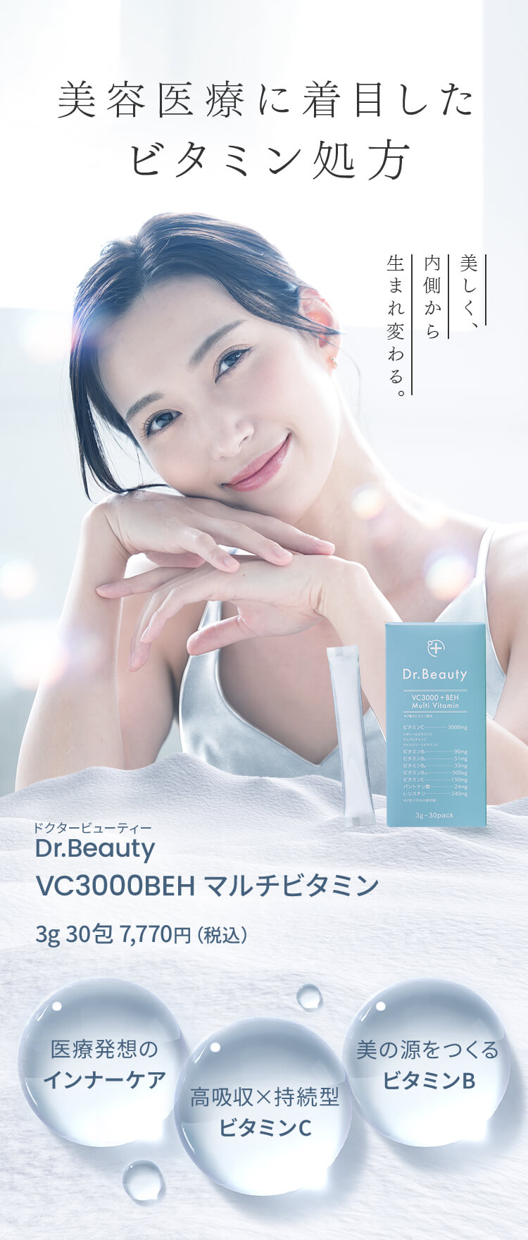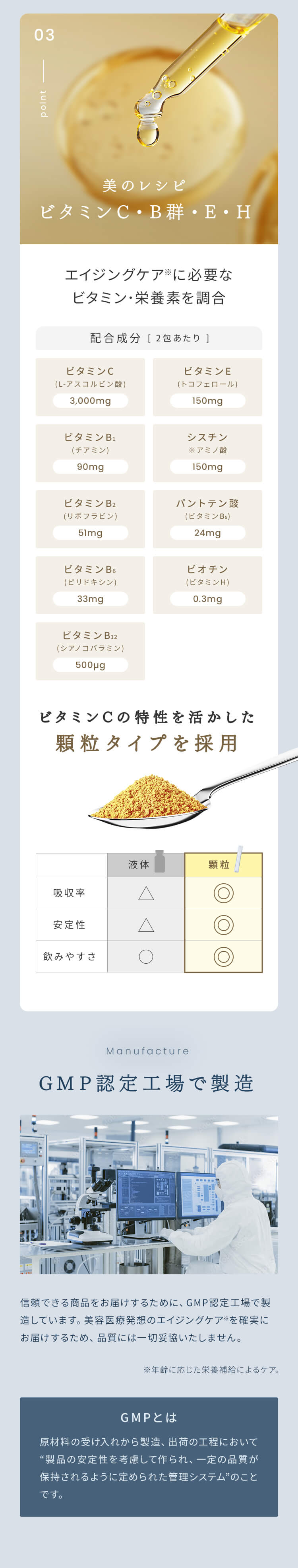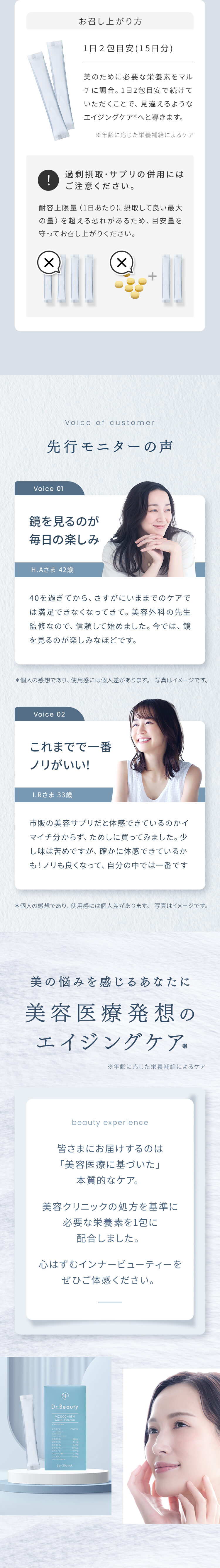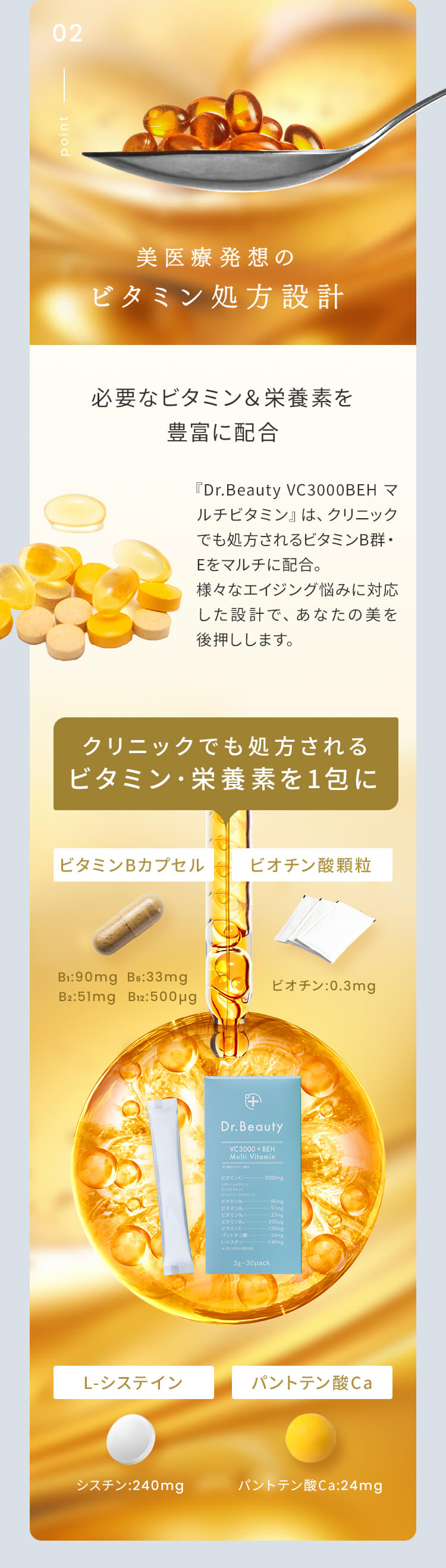| 特徴 | 01:医療発想のビタミン処方設計 02:独自の高吸収×持続型ビタミンC 03:ビタミン・栄養素の吸収アップ 04:こだわりの剤形 従来のビタミンCサプリメントの課題を解決し、理想の効果を実現する革新的な製品です。 リポソーム化ビタミンC、タイムリリースビタミンCなどを独自の処方設計で配合することで、高い吸収率と吸収持続性を両立しました。 さらに、美容と健康に必要な美容医療機関でも処方されるビタミン・栄養素を配合したマルチビタミンサプリメントです。 |