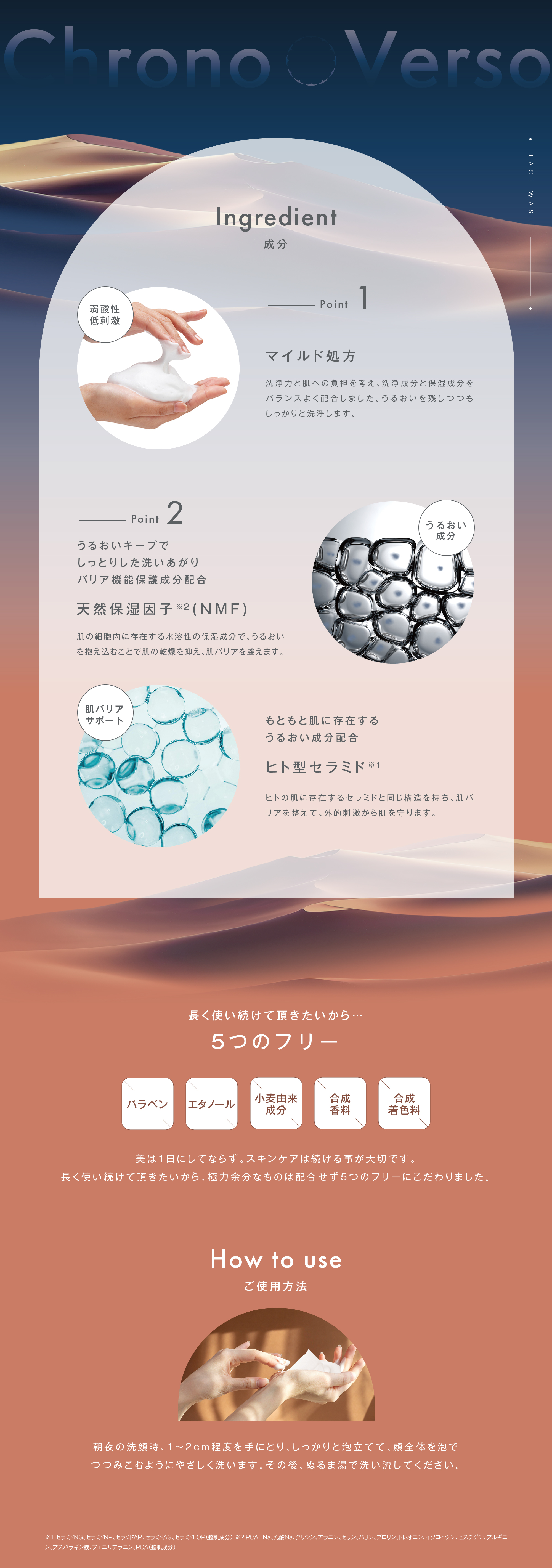 | ご使用方法 | 朝夜の洗顔時、1~2cm程度を手にとり、しっかりと泡立てて、顔全体を泡でつつみこむようにやさしく洗います。その後、ぬるま湯で洗い流してください。 |